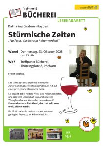 Der Jahreszeit entsprechend nimmt die Autorin und Kabarettistin das Publikum mit auf eine spritzige und stürmische Reise. Sie erzählt dabei heitere Wein- und Kelleranekdoten und lässt ihre Leserschaft in manch illustres Weinglas schauen. Was dabei herauskommt? Ein sehr humorvoller Abend, der Lust auf Lesen und Zuhören macht.